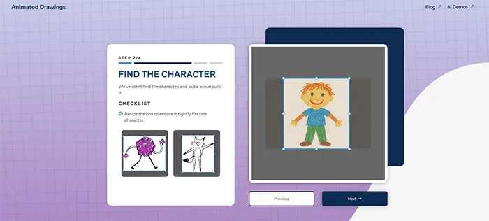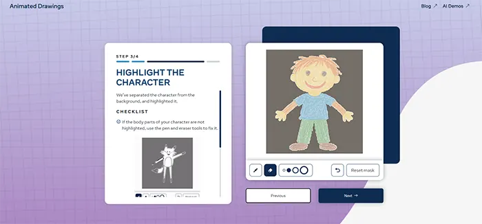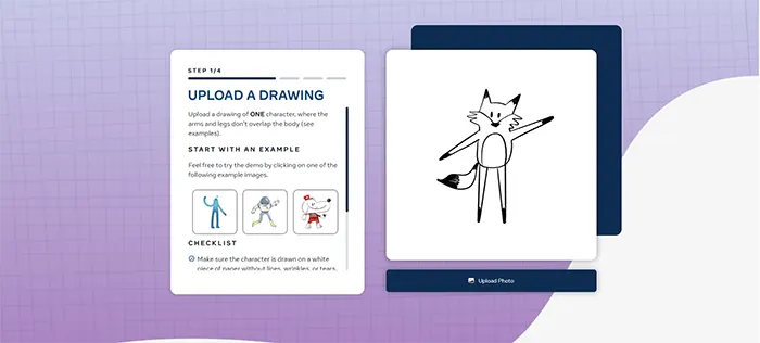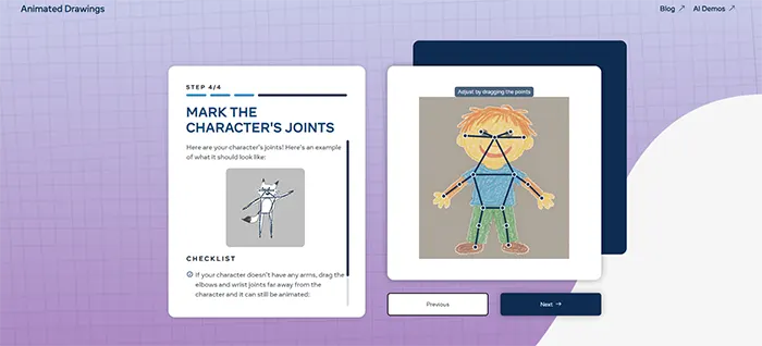 وبسایت بهصورت خودکار نقاط حرکتی (مفاصل) را در نقاشی شما تشخیص میدهد. در صورت نیاز، میتوانید این نقاط را بهصورت دستی تنظیم کنید تا حرکات انیمیشن طبیعیتر به نظر برسند. پس از اطمینان از تنظیمات، روی “Next” کلیک کنید.
