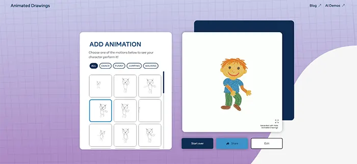 تبریک! حالا نقاشی شما به زیبایی و روانی یک انیمیشن شروع به حرکت میکند.در این بخش، میتوانید از میان حرکات مختلف مانند رقصیدن، خندیدن، پریدن یا راهرفتن یکی را انتخاب کنید. با انتخاب هر حرکت، پیشنمایشی از انیمیشن نمایش داده میشود.